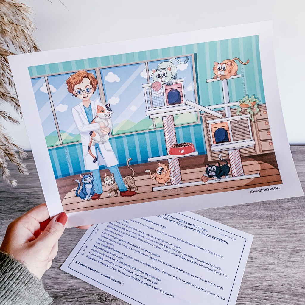 Voici un nouveau PDF. Le patient doit lire les phrases et retrouver les différents chats dans l’image. Attention ! Certains sont cachés, il faudra les repérer, et bien évidemment, lorsque la visite sera terminée, il faudra rendre chaque chat à son propriétaire. Y parviendrez-vous ?