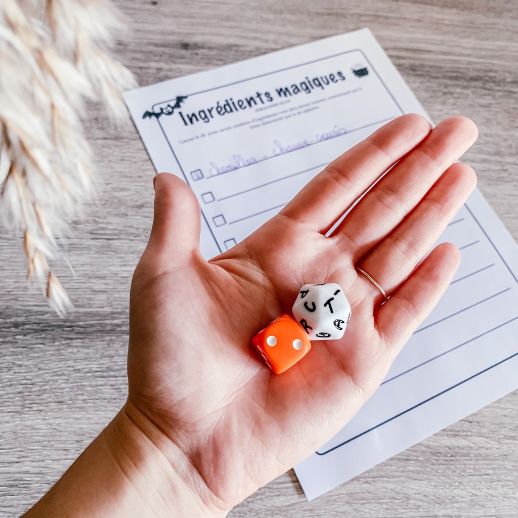 Vous retrouverez le dé alphabet ici, et le dé orange vient de notre kit de jeux.