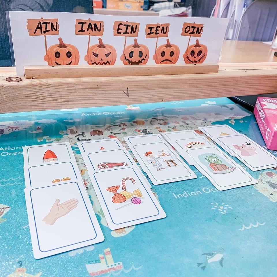 J’ai trouvé ces citrouilles qui me permettent de réaliser (notamment) des activités de tri, et que j’ai combinées, ici, avec notre combi’cartes son /in/ et trigraphes.