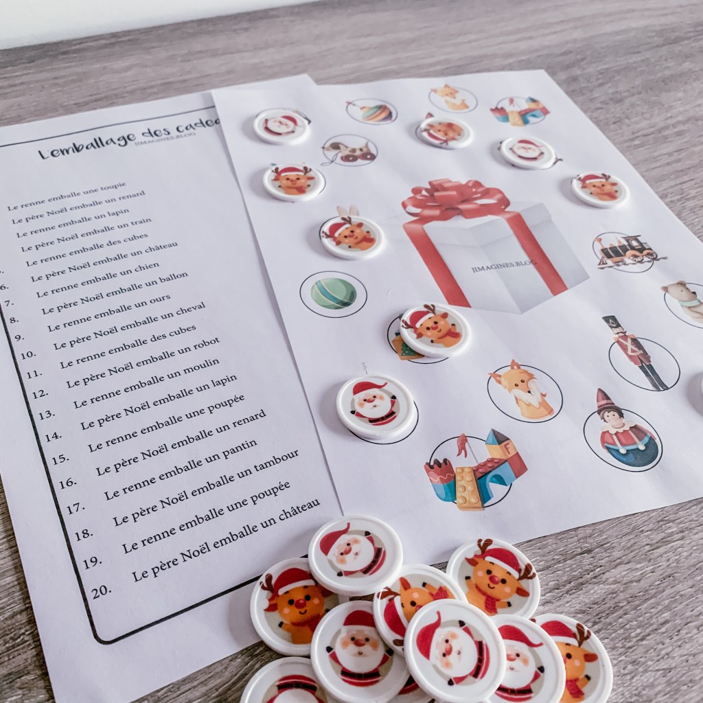 Voici une petite idée de jeu pour utiliser nos jetons de Noël (vous pouvez aussi jouer sans évidemment) ; vous allez prendre les cartes avec lesquelles vous souhaitez jouer, des cartes que vous avez créées ou des cartes de n’importe quel jeu pour sélectionner votre objectif de travail. Il vous faudra aussi un dé et des jetons.