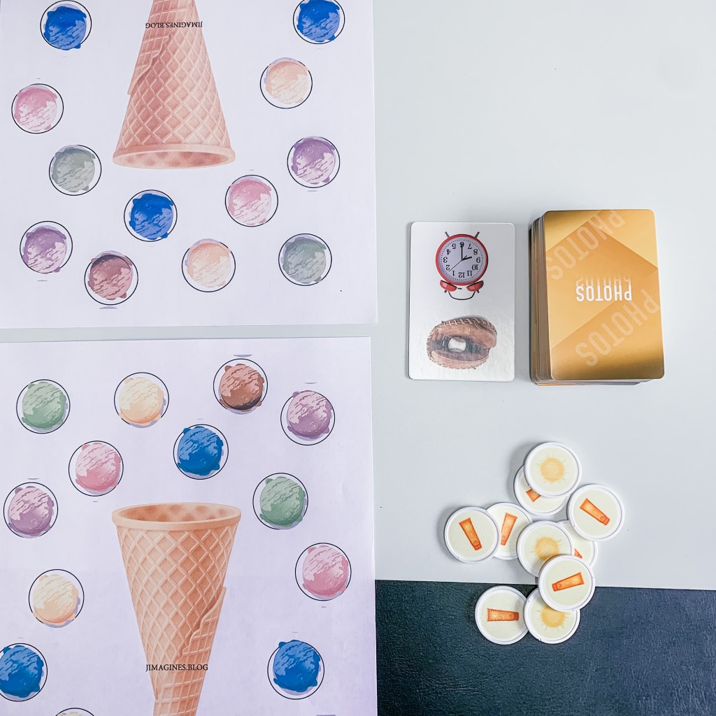 Voici une petite idée de jeu pour utiliser nos jetons d’été (vous pouvez aussi jouer sans évidemment) ; vous allez prendre les cartes avec lesquelles vous souhaitez jouer, des cartes que vous avez créées ou des cartes de n’importe quel jeu pour sélectionner votre objectif de travail. Il vous faudra aussi un dé et des jetons.