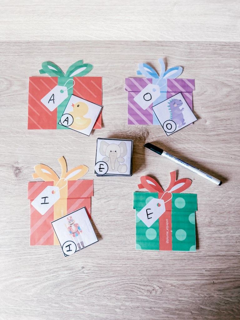 🎁 Préparation du Jeu : le jeu se compose de quatre cadeaux et de cartes représentant divers jouets. Avant de commencer, inscrivez les lettres cibles que vous souhaitez travailler avec l’enfant sur chaque cadeau et sur les cartes jouets. Vous pouvez ajuster le nombre de cadeaux selon vos besoins.