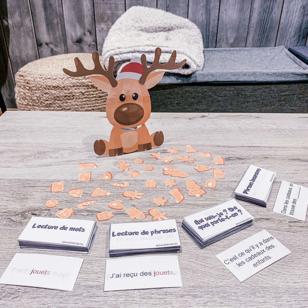 Pour pouvoir donner un biscuit au renne du père Noël, il faudra lire/répondre correctement à la/aux carte(s) piochée(s). Je vous propose 4 paquets de cartes différents, suite à vos demandes :